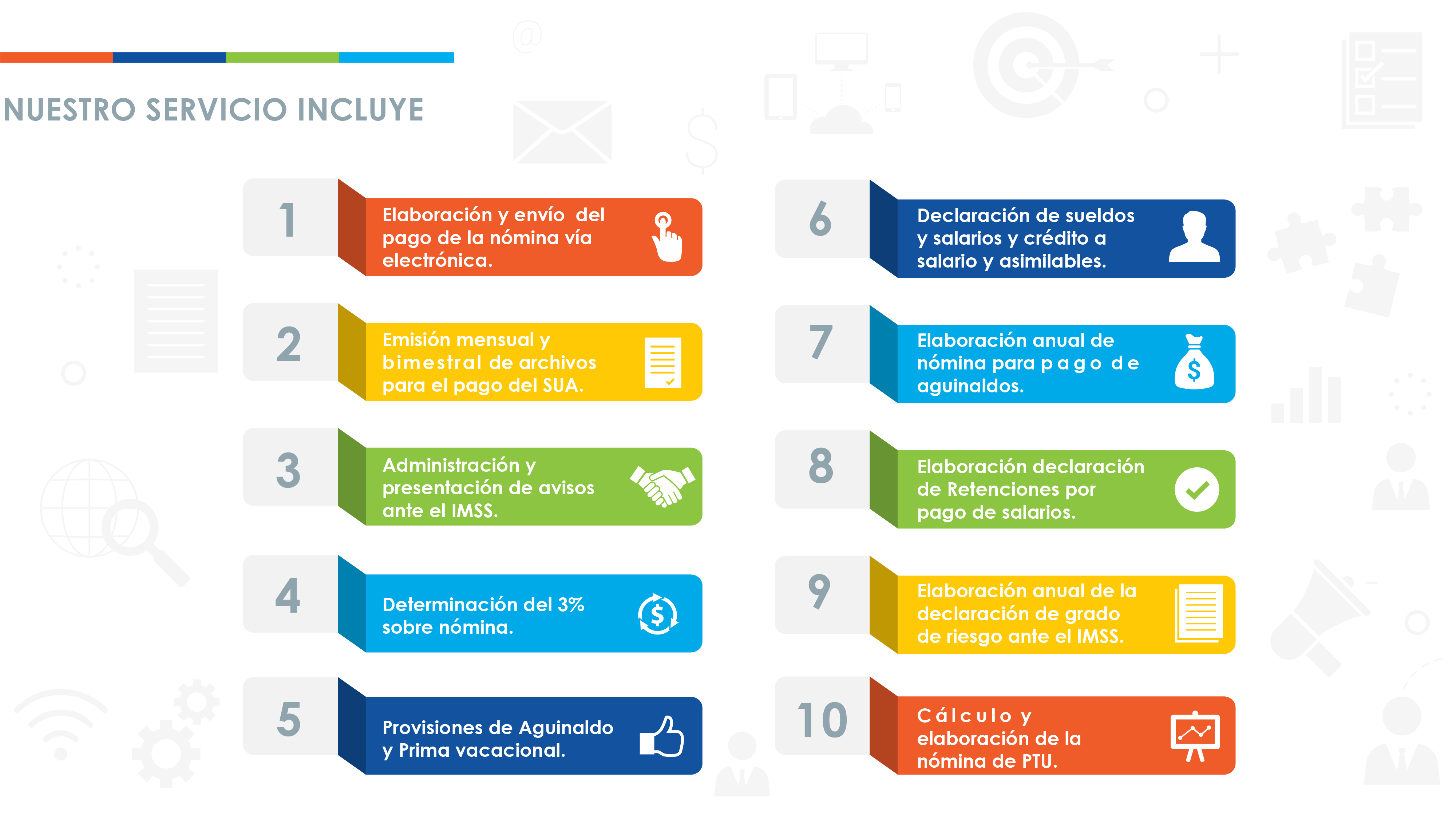 Este dervicio le permite optimizar los procesos internos de su empresa al desahogar el trabajo de su personal contable y administrativo, reduciendo costos al eliminar también gastos inherentes a este servicio. Nos hacemos responsables de la elaboración y cálculo de su nómina; así como del pago puntual en la fecha que se nos indique.